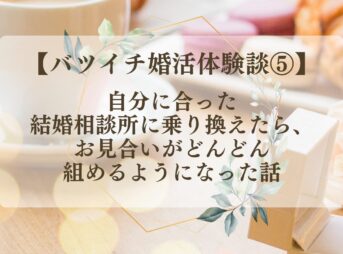 せっかく結婚相談所に入ってお見合いも交際もできるようになったのに、方向性を見誤っていたことに気づいた私。 結婚観を見直しつつ、理想は下げず、プライベートでは好きなことで充実を図ると婚活状況はガラッと変わってきました。 前回の記事はコチラ→【体験談】パートナーエージェントに乗り換えたら、お見合いがどんどん組めるようになった話 結局どこで・どんなタイミングで今の夫と出会ったのか? 婚活をスタートしてから約3年。バツイチ婚活体験談の最終話です。 追う恋愛から追われる恋愛へ逆転現象! 結婚相談所での活動も1年半を ...
